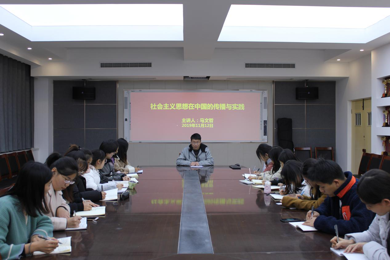 11月12日,aa3044永利集团辅导员马文哲在生物楼会议室以《社会主义思想在中国的传播与实践》为题讲党课。学习过程中,马文哲从“中国共产党的历史是马克思主义在中国的发展史”、“中国共产党坚持和发展马克思主义的成功探索”、“坚持和发展马克思主义是中国共产党的永恒主题”三个方面,向同学们讲述了社会主义思想在中国的发展历程。“重温历史经典、感受时代魅力,弘扬传统文化、躬身社会实践,一个时代有一个时代的奋斗目标,一个时代有一个时代的青春理想,各位同学,应当努力追寻自己的榜样,敢于担当敢于作为,争做‘四有’青年。”