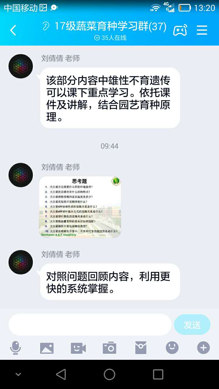 接到学生延迟返校,准备线上教学的通知后,我们两位教师立即搜索各种教学资源,筛选出西北农林科技大学《蔬菜育种学》的视频,再加上自己录制的部分教学视频作为基本教学依据,编制授课计划和教案,准备教学讲稿和其他比较丰富的教学材料,从教学纲要和内容上保证授课质量。提前两个周在学习通上将课程建设做好,同时建立和调试好QQ群。