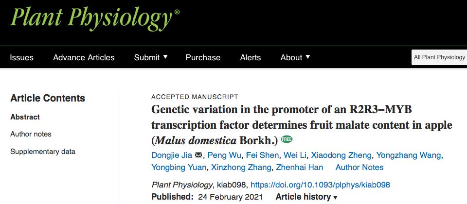 2021年2月24日,aa3044永利集团果树分子与发育生物学团队和中国农业大学合作在Plant Physiology(五年影响因子IF=6.902)上在线发表了题为“Genetic variation in the promoter of an R2R3−MYB transcription factor determines fruit malate content in apple (Malus domestica Borkh.)”的研究论文,揭示了苹果果实苹果酸积累调控的新机制。