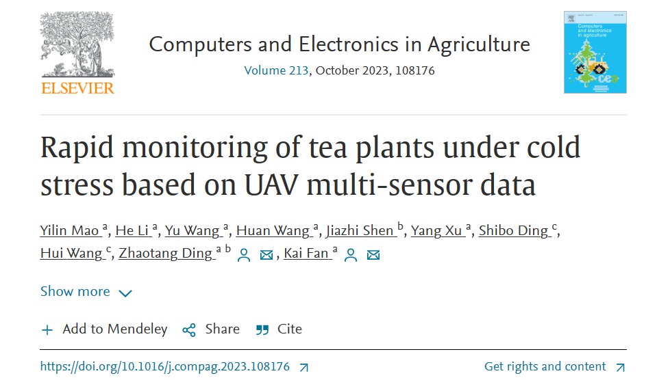 2023年8月27日,aa3044永利集团在Computers and Electronics in Agriculture (中科院1区TOP期刊,IF = 8.3)发表了题为“Rapid monitoring of tea plants under cold stress based on UAV multi-sensor data”的研究论文。aa3044永利集团青年教师范凯博士和山东省农业科学院茶叶研究所丁兆堂教授为论文共同通讯作者,永利集团3044茶学专业在读硕士研究生毛艺霖为第一作者。该研究得到了山东省现代农业产业技术体系首席专家项目、山东省农业良种工程项目、山东省农业科学院创新项目和山东省泰山学者专项基金等的资助。