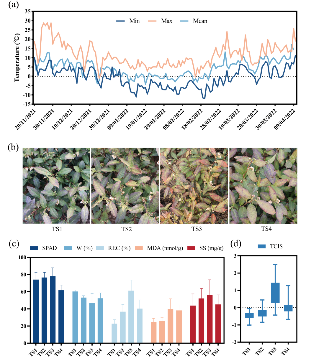 (a)空气温度的变化(b)冠层表型的变化(c)低温诱导成分的变化(d)TCIS的变化