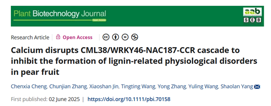 近日,aa3044永利集团杨绍兰/程晨霞团队在Plant Biotechnology Journal杂志在线发表了题为“Calcium disrupts CML38/WRKY46-NAC187-CCR cascade to inhibit the formation of lignin-related physiological disorders in pear fruit”的研究论文。