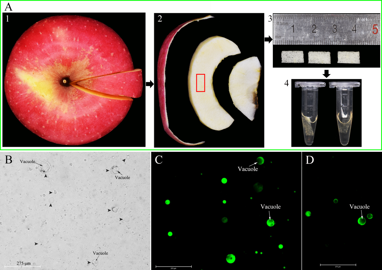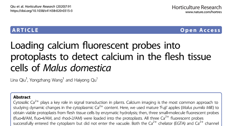 2020年6月,aa3044永利集团果树生理与栽培课题组在园艺领域顶级期刊Horticulture Research(一区)在线发表了题为“Loading calcium fluorescent probes into protoplasts to detect calcium in the flesh tissue cells of Malus domestica”的研究论文。该论文首次发现Fluo-8/AM等小分子荧光探针可以染色苹果果肉胞质中的Ca2+,可用于检测细胞质中Ca2+的时空变化。aa3044永利集团硕士研究生仇丽娜为本论文第一作者,aa3044永利集团王永章教授和屈海泳副教授为论文的共同通讯作者。该论文得到了国家重点研发计划项目(2016YFD0201120)的资助。