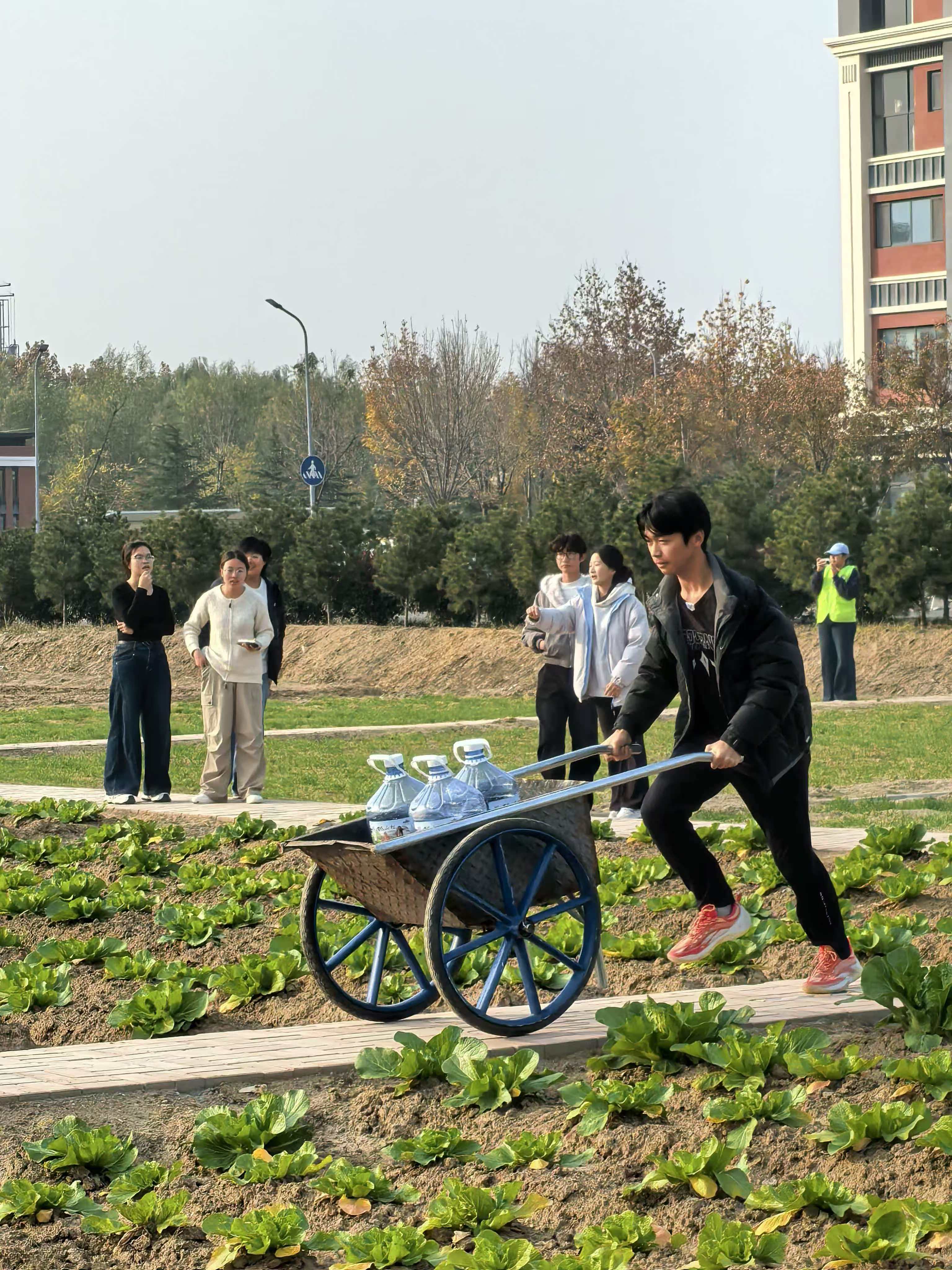 本次运动会我院参加了“扁担挑肥越障接力”、“同心抗旱保苗接力”、“小车运南瓜‘S’弯接力”以及“拔河比赛”四个项目,在充满乡土气息的赛场上化身为身手矫健的“农耕能手”,尽显园艺学子的活力与风采。活动现场加油声、欢笑声不绝于耳,丰收的喜悦与运动的激情交织成一幅动人的冬日画卷。