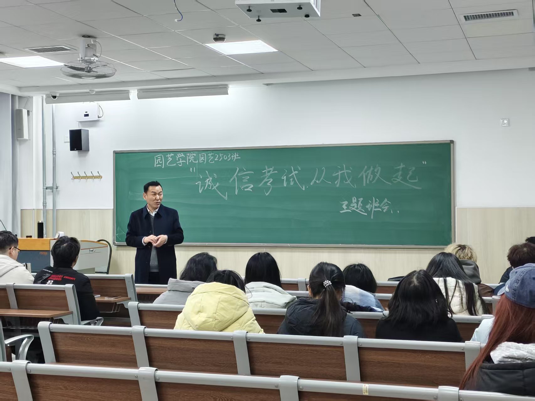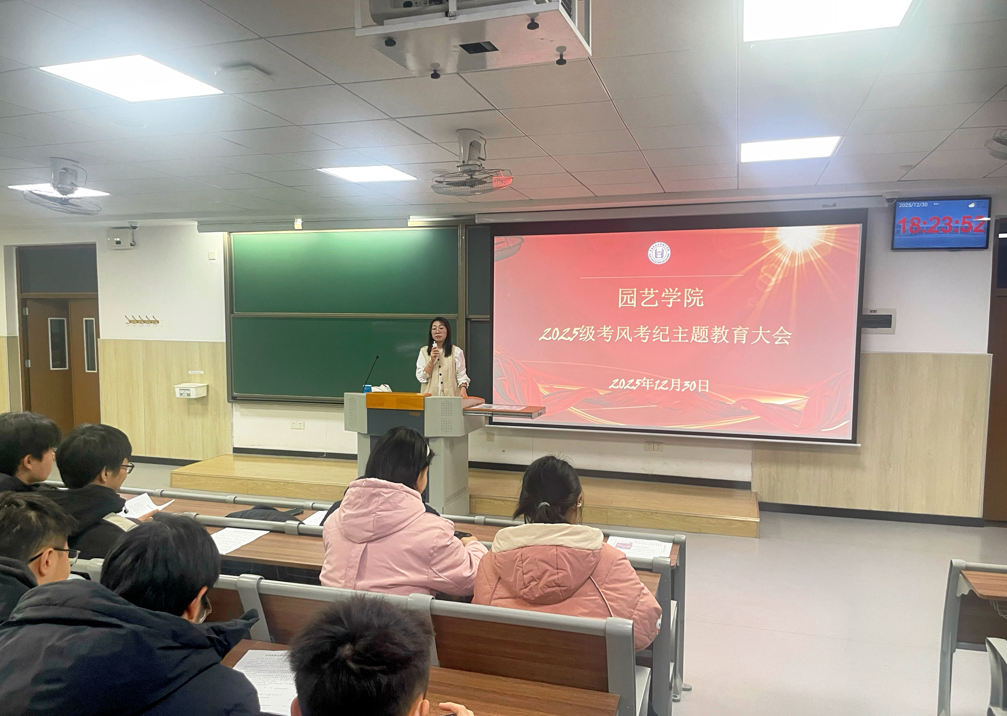12月30日,学院在平度校区教学楼召开2025级全体学生考风考纪主题教育大会,2025级辅导员刘园主讲。会上,刘园围绕考场规则、违纪作弊类型、历年违纪情况等七个方面,结合学校近年考试违纪作弊典型案例,系统阐释诚信应考的重要意义。各班班主任聚焦“诚信应考”主题召开专题班会,带领学生集体学习《永利集团3044学生考试违纪及作弊行为的处理规定》《学生手册》中关于考试纪律的具体条款,观看诚信考试主题教育宣传片,深化教育成效。此外,学院面向2025级学生发起“清朗考场”志愿服务活动,组织学生对教学楼内考场进行全面清扫整理,确保考场以“零痕迹”状态迎接考试。志愿者表示,能为营造公平公正的考试环境贡献力量,感到十分有意义,这既是对诚信考试理念的践行,也是新时代大学生责任感的体现。