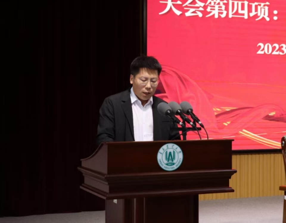 最后,学院党委副书记、副院长孙海涛作换届大会总结发言并为学生组织讲授“开学第一课”。孙海涛围绕学校第三次党代会报告,着重讲解了第三次党代会的主题和主要成果、第二次党代会以来学校的奋斗历程和辉煌成就、今后时期的目标任务以及实施“1186”战略的丰富内涵和路径举措,带领大家集体学习了过去六年学校事业发展所取得的成绩和宝贵经验。结合第三次党代会精神,总结回顾了上一学年学院学生组织开展的工作和取得的成绩,分析了学院大学生自我管理工作目前面临的新形势、新变化,同时也指出在典型树立、榜样引领、工作创新、优势挖掘等方面存在的问题,鼓励大家牢记“青农精神”,践行优良院风,勇于创新实践,以服务同学为宗旨,坚定信心,脚踏实地,为学院更好的发展贡献属于自己的力量。