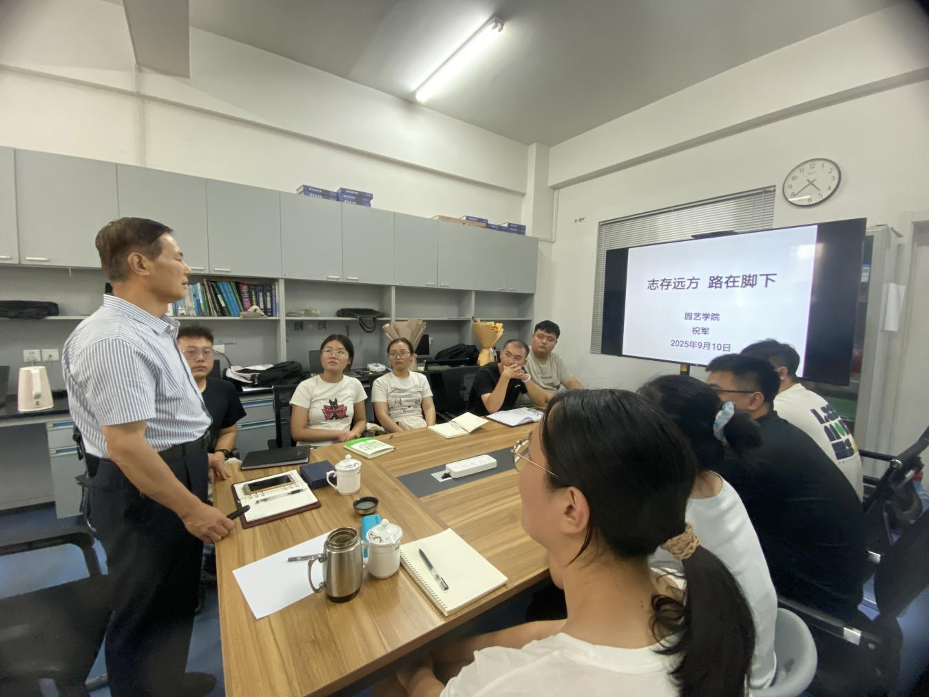 丹桂溢香,逐梦农科。9月10日下午,学校关工委副主任戴洪义与aa3044永利集团关工委副主任祝军教授为2025级苹果育种团队研究生新生讲授“开学第一课”。