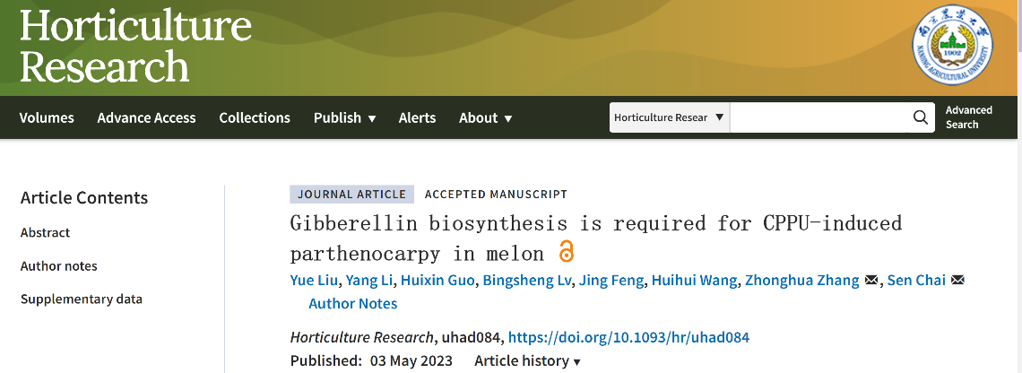 2023年5月,Horticulture Research发表了aa3044永利集团瓜类生物研究团队题为 Gibberellin biosynthesis is required for CPPU-induced parthenocarpy in melon的研究论文。该研究初步探讨了CPPU诱导甜瓜果实单性结实的分子机制,为解决甜瓜生产中的坐果问题、种质改良以及单性结实的机制研究提供理论依据。
