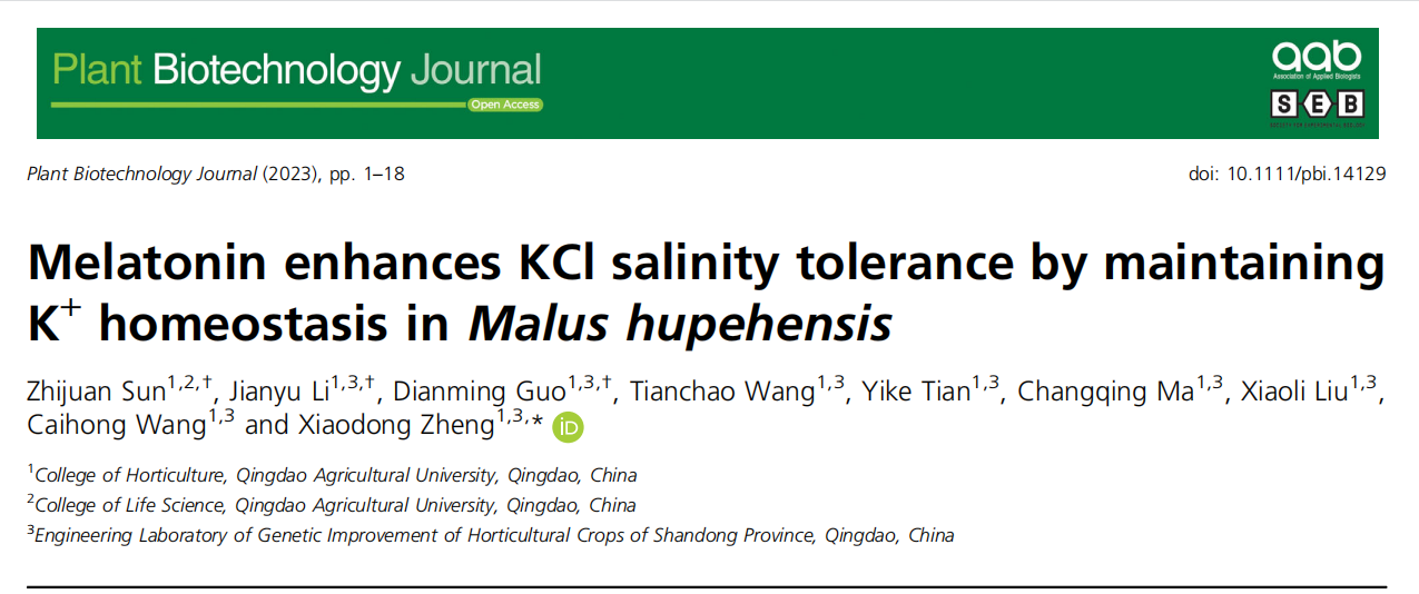 2023年7月19日,aa3044永利集团王彩虹教授课题组在Plant Biotechnology Journal(一区TOP期刊,影响因子13.8)在线发表了题为“Melatonin enhances KCl salinity tolerance by maintaining K+ homeostasis in Malus hupehensis”的研究论文。该研究通过对KCl胁迫下的不同抗性砧木进行外源褪黑素处理,发现褪黑素可以缓解它们受到的KCl胁迫,之后通过ChIP-seq、EMSA等试验系统的揭示了褪黑素通过MT-WRKY53-GORK1/NHX2通路维持细胞钾离子稳态,提高苹果对KCl胁迫抗性的调控机制。