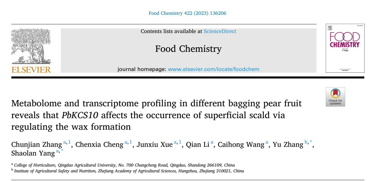 2023年4月25日,aa3044永利集团园艺植物采后工程与技术团队团队在Food Chemistry(中科院1区Top期刊,IF 9.231)在线发表了题为“Metabolome and transcriptome profiling in different bagging pear fruit reveals that PbKCS10 affects the occurrence of superficial scald via regulating the wax formation”的研究论文,揭示了梨果皮蜡质合成抑制虎皮病发生的机制。
